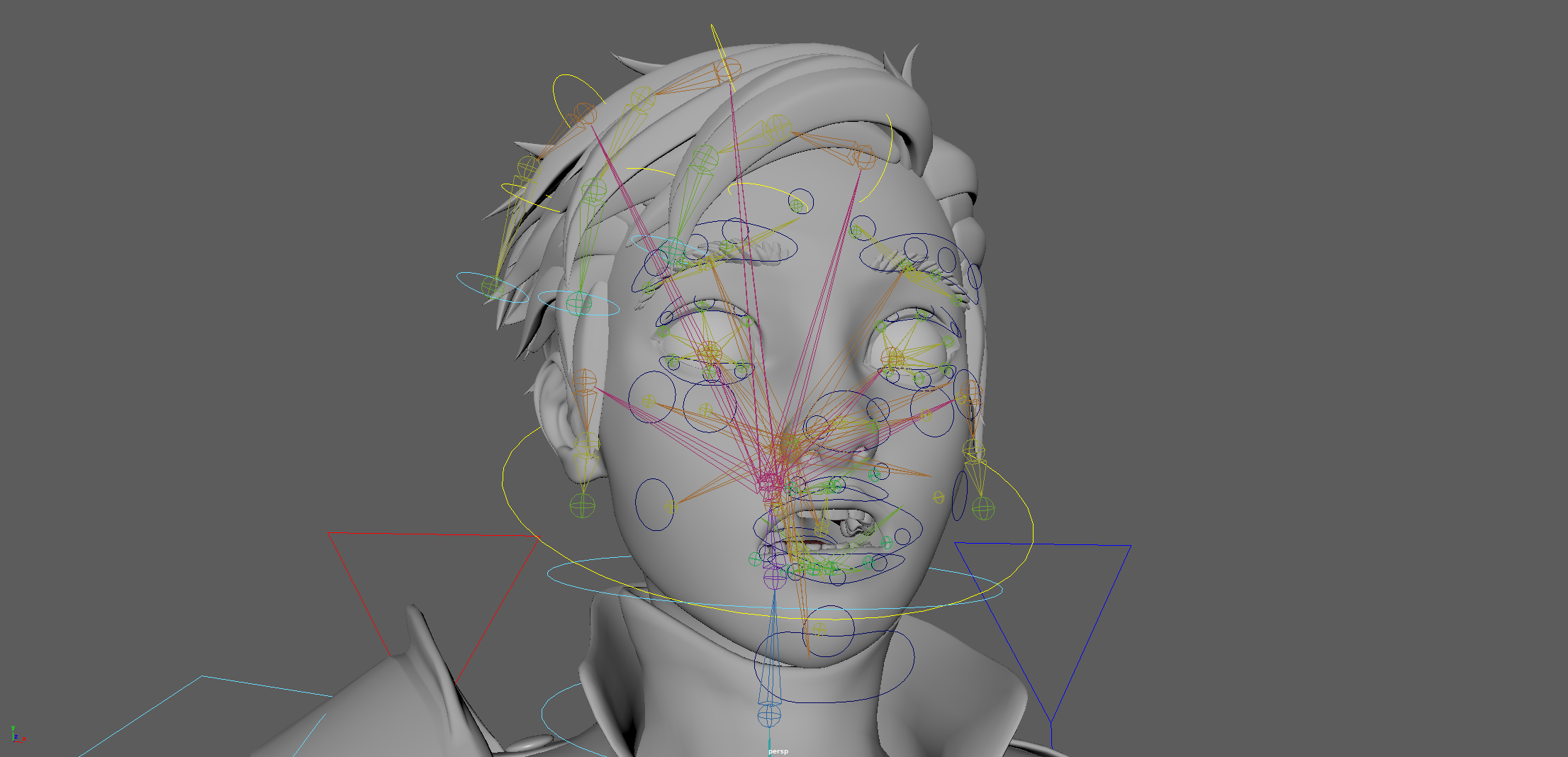 The last addition to her came between episodes. Originally her face had been crafted with a blend shape system, which is, for those unfamiliar, a system in which the face is linked to several different facial shapes and expressions, and you can blend between them in the animation. I personally never cared too much for blend shapes as the primary means of facial animation, particularly in a more cartoonish character, because unless you have a considerable amount, you’re left with a somewhat restrictive set of facial poses, and sometimes you need to stretch or push things in a more exaggerated fashion. After a few tests I wasn’t too happy with how it looked, so I threw out the system and replaced it with a bone based facial rig. Now she has a couple dozen bones in her face, all controllable, with the ability to add or adjust them on the fly, should I need to. Adding bones to a rig in Unreal has never given me trouble, but adding blend shapes has caused me some headaches. I still have a few blend shapes in there, but mostly for subtle corrections and some automated things. Since you don’t see her face for a while, I didn’t start on this until after the first episode had premiered, making its (very brief) debut in Part II.